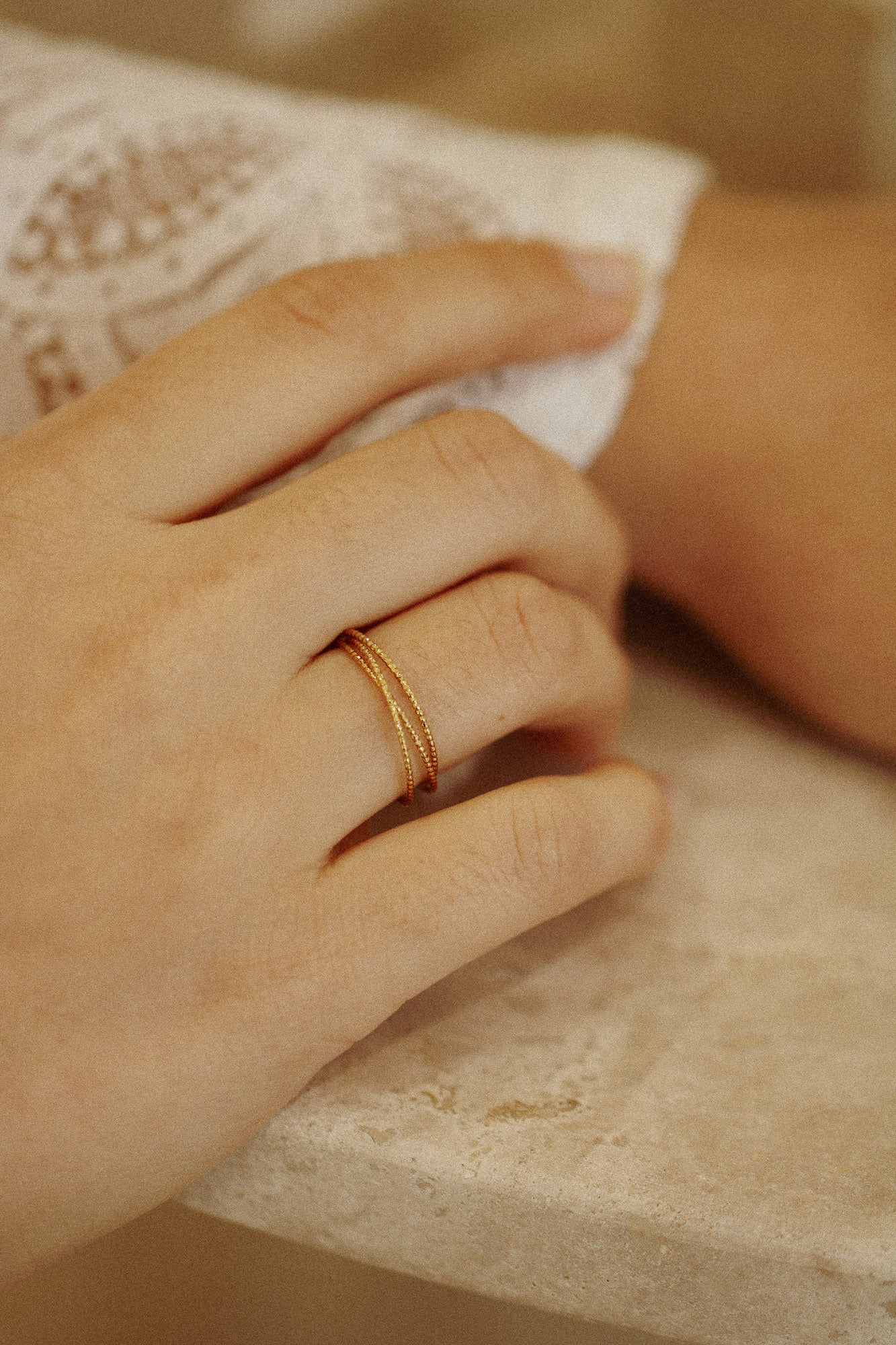 Raffinée et délicate, notre bague fine Éléna se compose de trois anneaux entrelacés. Ses lignes fines et texturées ajoutent une touche de raffinement subtil, parfaite pour un look moderne et discret.