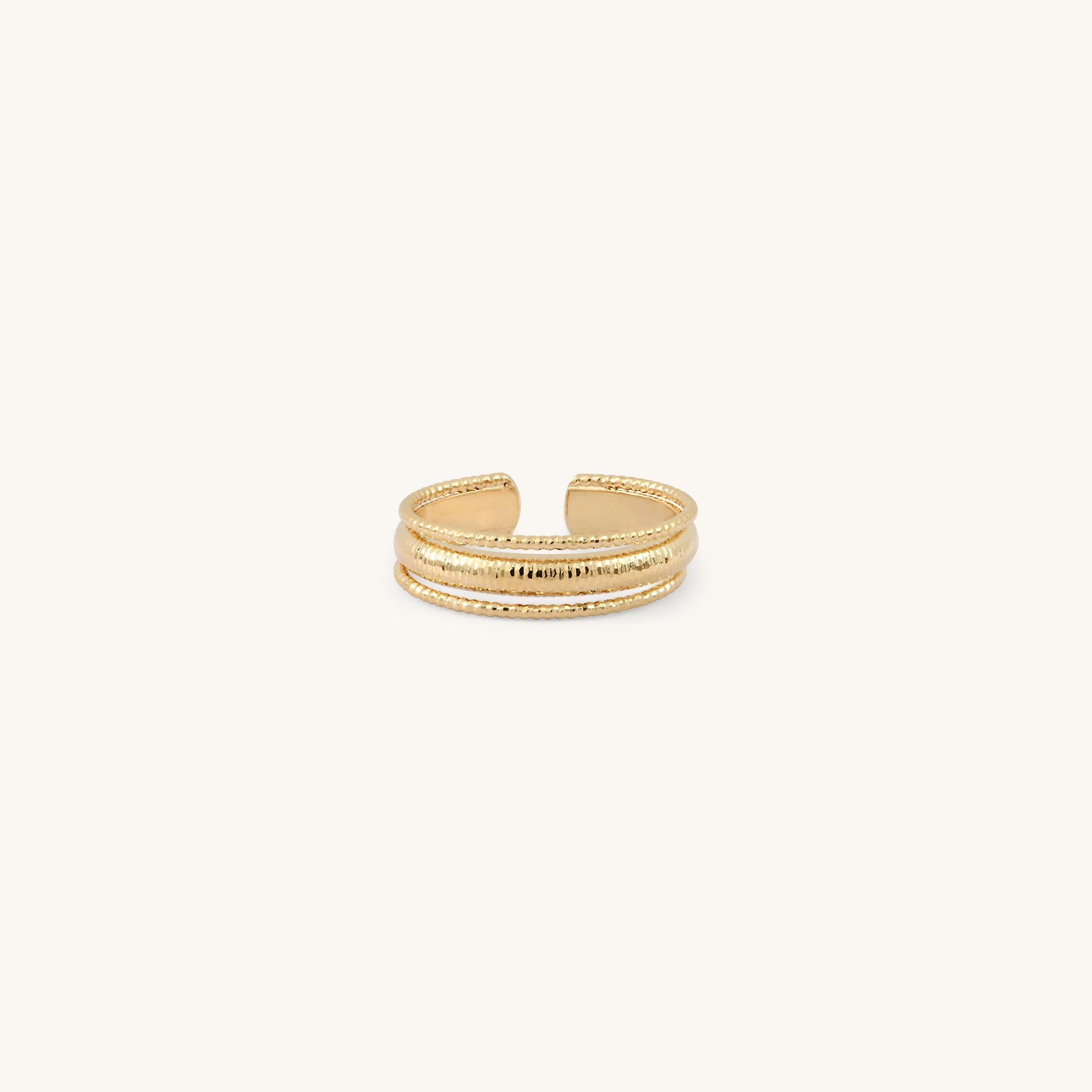 Trois anneaux finement travaillés, pour un style intemporel. La bague Éléna, avec son design audacieux et ses bandes texturées, incarne l'élégance.