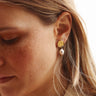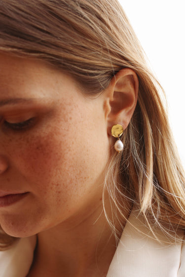 Un médaillon doré martelé, d’où pend une perle d’eau douce au fini nacré. Un contraste de textures, brute et lisse, pour une boucle sculpturale et féminine.