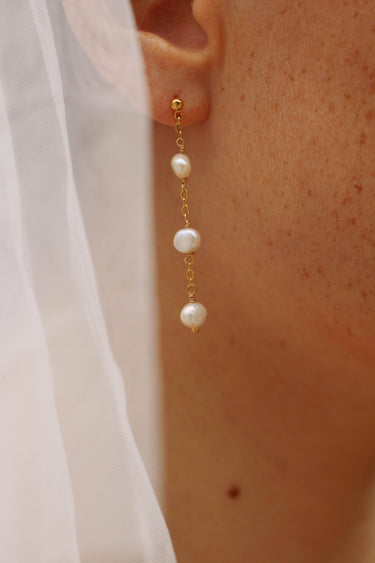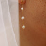Trois perles d’eau douce suspendues à une chaîne dorée, comme en apesanteur. Un jeu de volumes et de lumière qui allonge la silhouette du visage. Pour la mariée, mais pas que.